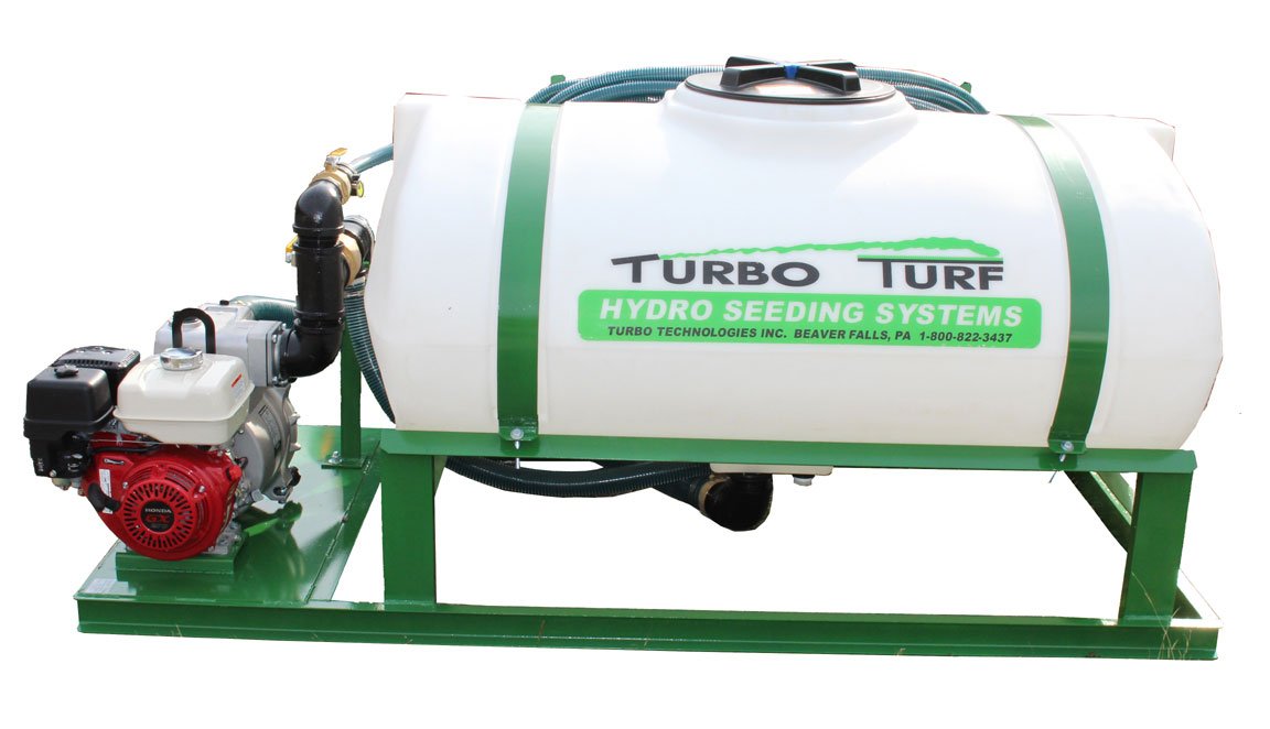The HS-300-E8 is a great value 300 gallon hydroseeder. 8 H.P. Honda engine with 3"×3" pump (333 GPM, 36 PSI). Powerful jet agitation with two 2" jets for strong rolling action; mixes a full load in under a minute. Oval tank, 16" opening for easy loading. Ideal for landscapers doing residential and commercial seeding (3,000–20,000 sq. ft. average). Up to 1.5 acres per day with a good water source. Also popular for golf courses, pipeline, schools, construction, parks.