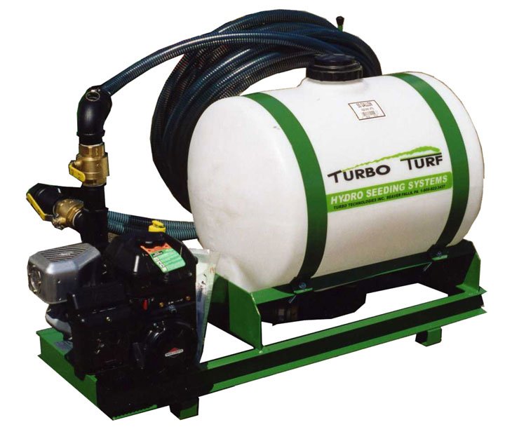 The HS-50 is a 50 gallon skid-type hydroseeder that seeds 650 square feet per load. It is equipped with a 6.5 H.P. Briggs Vanguard engine directly coupled to a 2"×2" high-volume centrifugal pump. The unit comes with 50' of 1¼" discharge hose, a gun and three nozzles (wide hydroseeding, straight distance, trim). Empty weight 195 lbs, loaded 595 lbs. Dimensions 24"W×52"L×29"H; skid 20"×52". Fits in a compact pickup or utility vehicle. Ideal for golf course repairs, cemetery, construction repairs, lawn repair and renovation. Material applied at ~30 GPM; spray time ~2 minutes. Handles up to 150' of hose; straight nozzle spray distance ~40'.